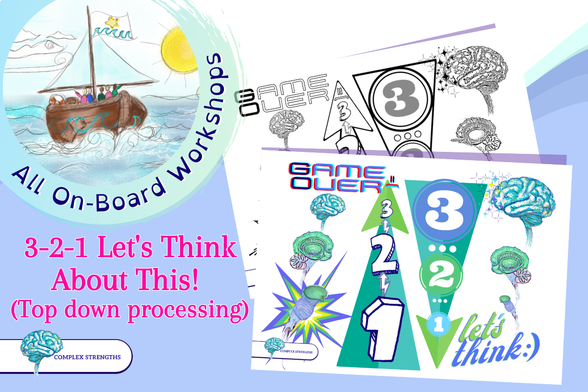 A Visual Exploration of 'bottom up' GO!/Game-Over processing, and 3...2...1...Let's Think About This 'top down' processing. The poster and colouring sheet are originally part of the All On-Board resources ⛵
